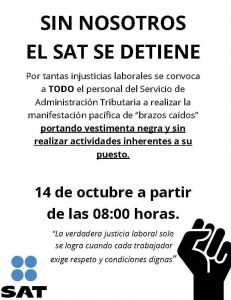 La convocatoria llama a todo el personal adscrito al SAT a unirse el martes 14 de octubre, a partir de las 08:00 horas, en una protesta laboral pacífica de brazos caídos, portando vestimenta en color rojo o negro.