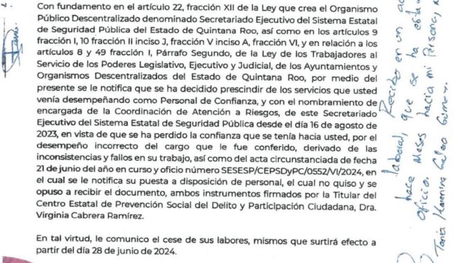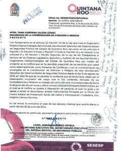 La denuncia había sido interpuesta el 29 de junio de 2024, apenas cinco días después de que Galera Gómez fuera notificada de su cese laboral como encargada de la Coordinación de Atención a Riesgos, según oficio firmado por el titular del Secretariado Ejecutivo, Adrián Martínez Ortega. El contexto temporal llamó la atención de los investigadores, al coincidir con su salida administrativa.