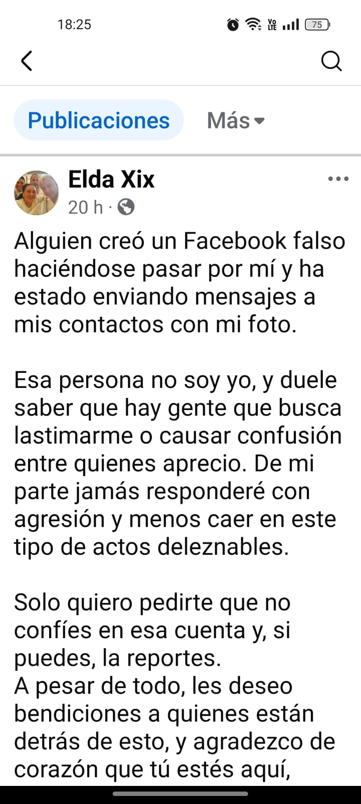 “Alguien creó un Facebook falso haciéndose pasar por mí y ha estado enviando mensajes a mis contactos con mi foto. Esa persona no soy yo, y duele saber que hay gente que busca lastimarme o causar confusión entre quienes aprecio”, expresó.