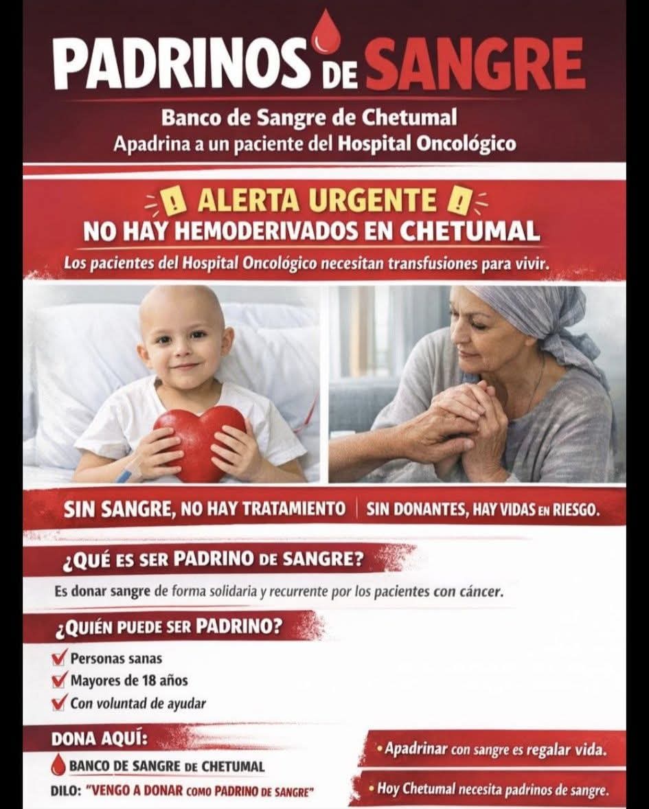 Un dato importante es que la falta de cultura de donación voluntaria es una de las principales causas del desabasto, por lo que es necesario generar conciencia social permanente. Mientras tanto, la campaña “Padrinos de Sangre” se mantiene activa como una línea de esperanza para los pacientes con cáncer del Hospital Oncológico de Chetumal, quienes hoy enfrentan una lucha doble contra la enfermedad y contra la escasez de sangre que les permite seguir viviendo.
