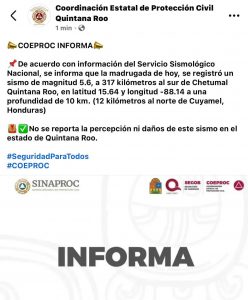 De acuerdo con el Servicio Sismológico Nacional (SSN), el sismo ocurrió alrededor de las 08:00 horas de este viernes 16 de enero, con una magnitud de 5.6 grados en la escala de Richter, localizado en costas de Honduras, a una distancia aproximada de 317 kilómetros de la capital del estado, Chetumal.