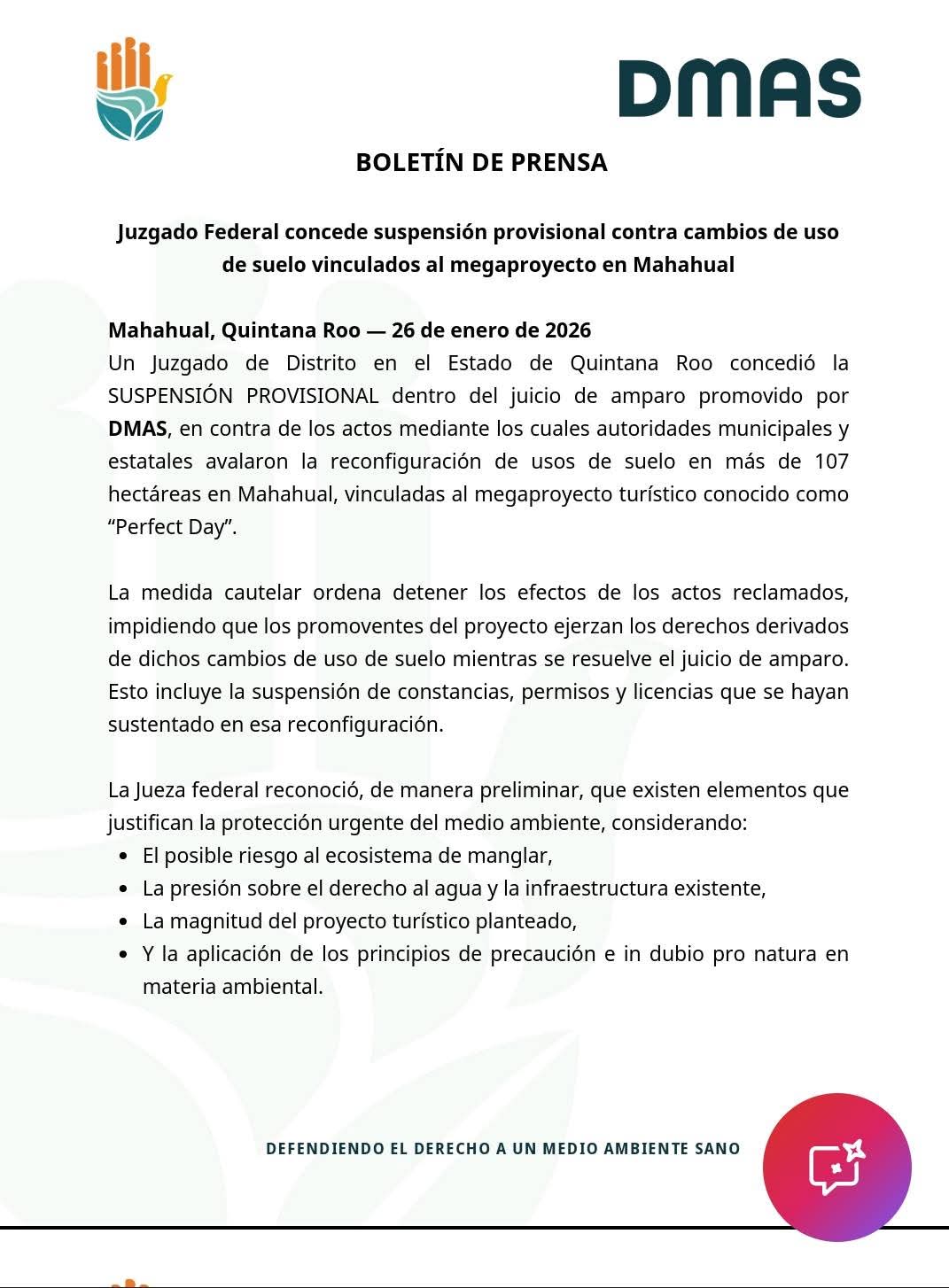 Un juzgado federal ordenó detener de manera provisional los cambios de uso de suelo vinculados al proyecto turístico “Perfect Day”, que busca desarrollarse sobre más de 107 hectáreas en la costa de Mahahual. La resolución, emitida dentro de un juicio de amparo promovido por la organización DMAS, suspende cualquier permiso, licencia o constancia derivada de la reconfiguración territorial avalada por autoridades municipales y estatales.